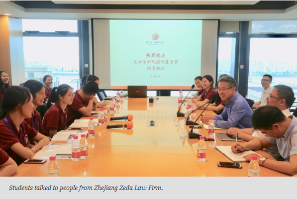 As a group, both Chinese and internationalstudents took part in a variety of law-related activities together. On thesecond day, they visited the Binjiang District People’s Court, where they had achance to attend two criminal trials. They were also invited to Zhejiang ZedaLaw Firm and an academic salon host by Prof. ZHAO Jun, with the theme of“Mutual Encouragement and Interaction of International Rule of Law and China’sRule of Law”.